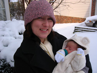 We had snow here on Monday night, so we took Aidan out for just a bit (see the picture!). Doesn’t he look cozy?